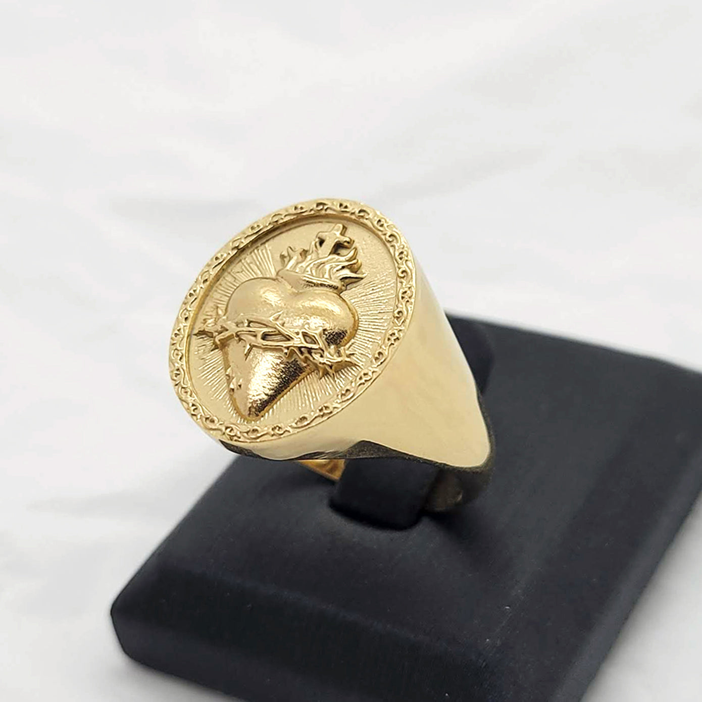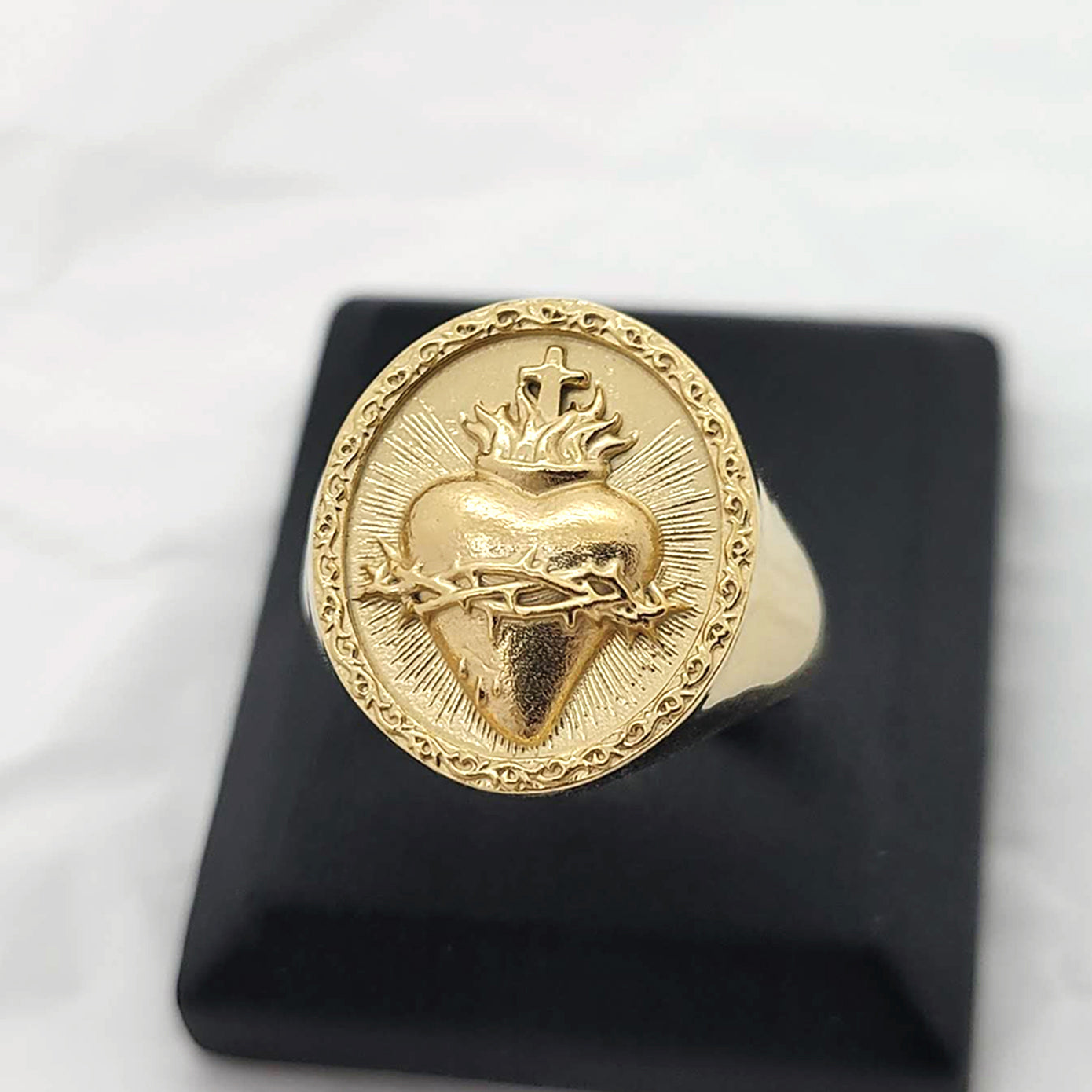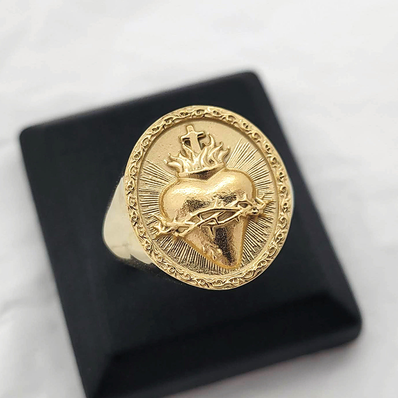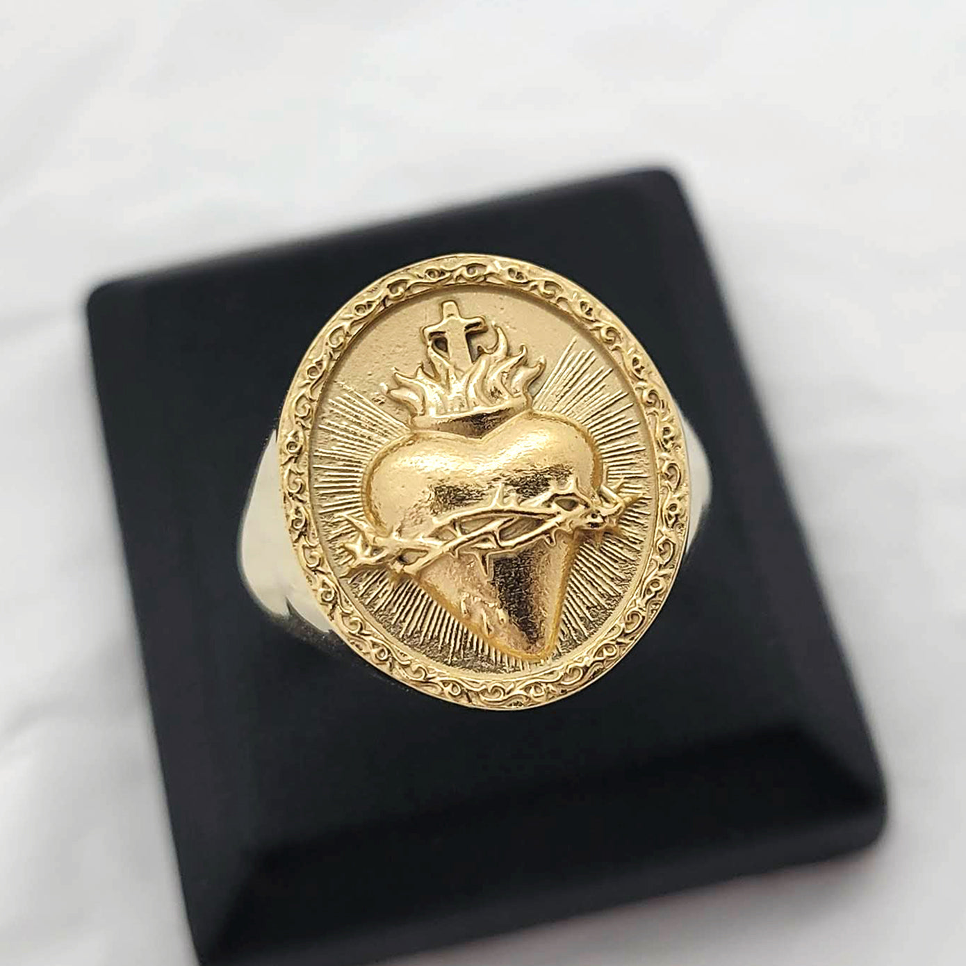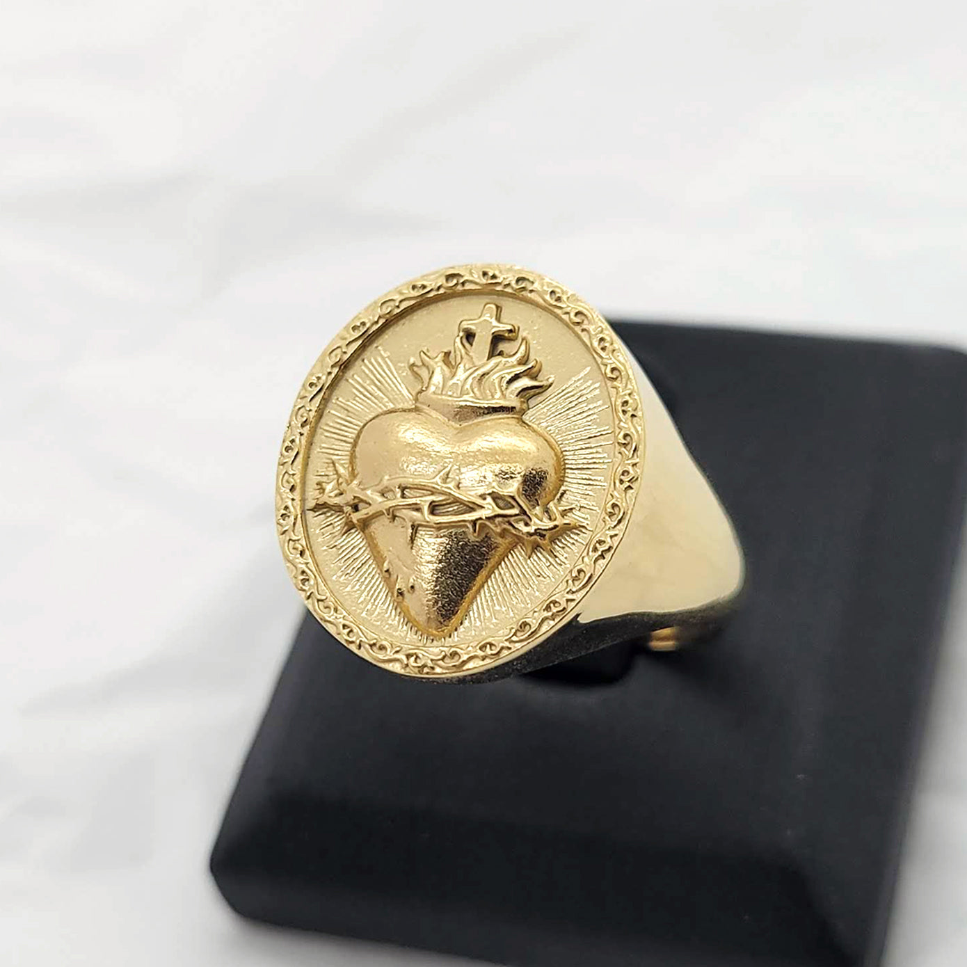 sacred heart of jesus that is a symbol of god's boundless and passionate love for mankind is main feature on the top oval of the ring.